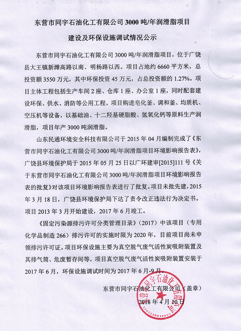 東營市同宇石油化工有限公司(蓋章) 2018年4月10日 |